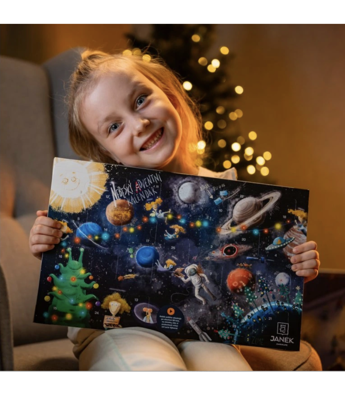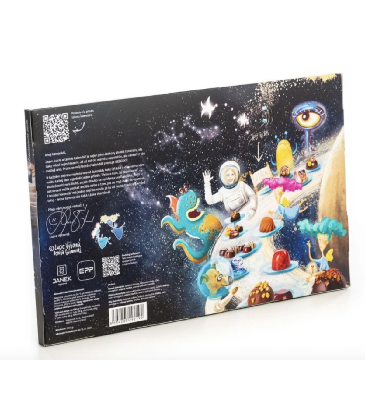 Darujte tento rok k adventu niečo naozaj výnimočné - Nebeský adventný kalendár z českej čokoládovne Janek. Každé z 25 okienok ukrýva poctivý kúsok ručne vyrábanej čokolády z tých najlepších surovín, bez palmového oleja, farbív a lepku. Vychutnáte si kombináciu mliečnej, horkej i bielej čokolády, ktorá poteší aj tých najnáročnejších maškrtníkov. Súčasťou kalendára sú aj krátke príbehy o hviezdach a vesmíre od Lucie Výbornej, dostupné cez QR kódy – advent sa tak stáva nielen sladkým, ale aj inšpiratívnym zážitkom. Nádherné ilustrácie od Denisy Grimmovej dodávajú celej kolekcii kúzelnú atmosféru.