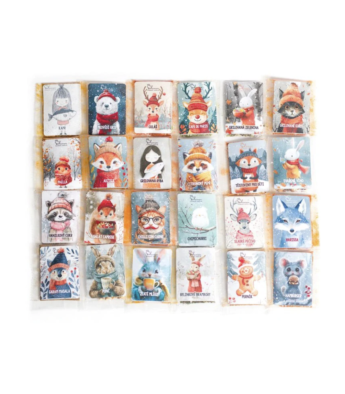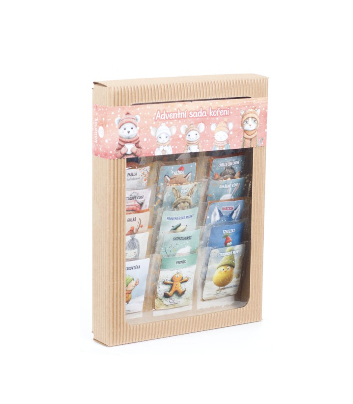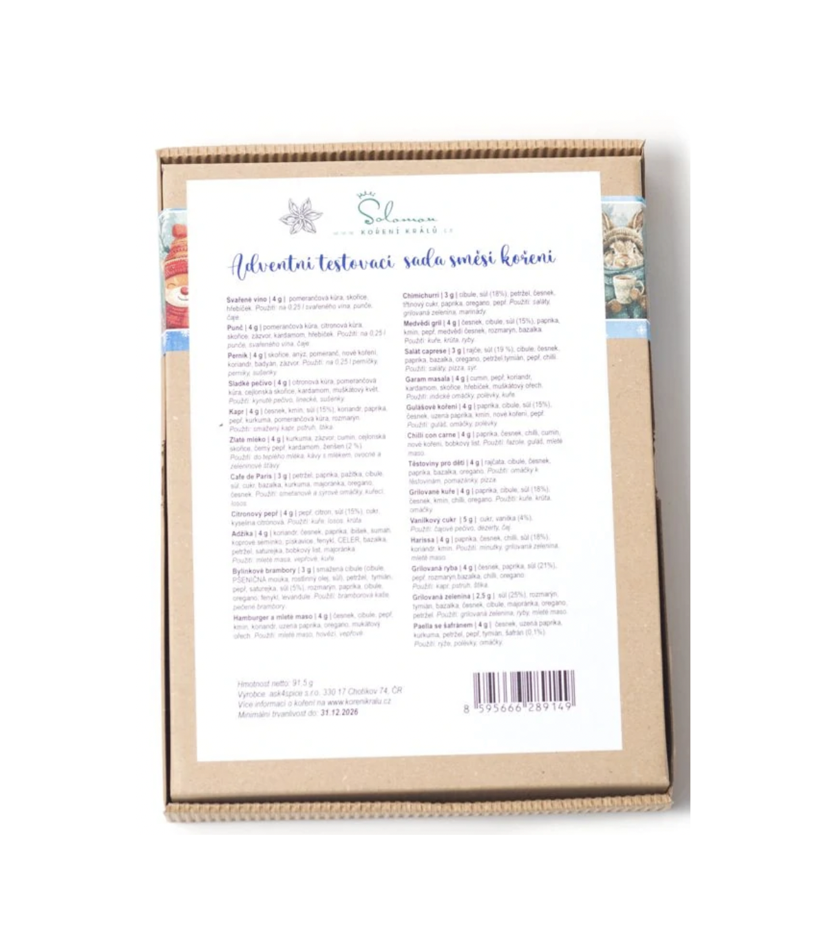 Sada obsahuje 24 malých vrecúšok s koreninami. Zloženie je ladené na zimnú sezónu, preto v nej nájdeme koreniny na varené víno, punč, dáta masalu, perník či vanilkový cukor.