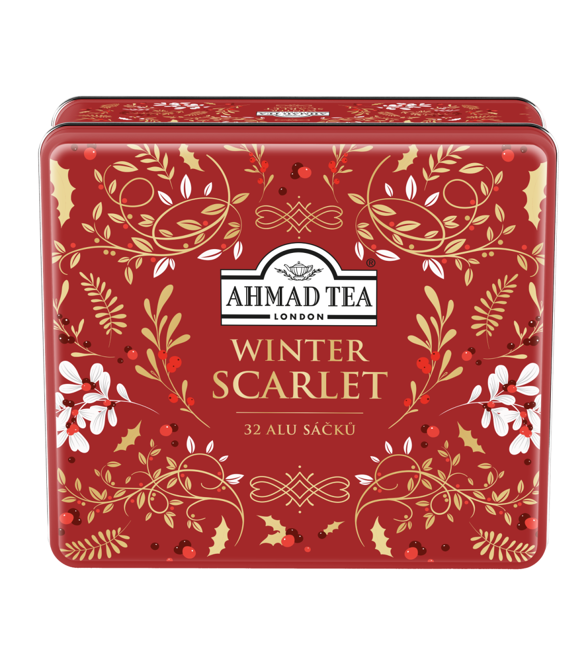 Elegantná kazeta Ahmad Tea Winter Scarlet prináša 32 čajových vrecúšok v štyroch obľúbených zmesiach: