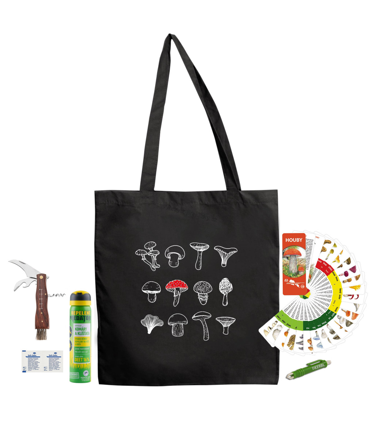 Perfektný darček pre všetkých nadšených hubárov. Darujte im túto originálnu hubársku súpravu, kde nájdu všetko, čo na ceste po lese budú potrebovať. Originálna bavlnená taška s motívom húb sa hodí na všetky nevyhnutnosti, ktoré si do lesa hubár vezme. Alebo ju môže použiť na nájdené kúsky. Účinný repelent odradí dotieravý hmyz, ktorý znepríjemňuje život všetkým obyvateľom lesa. Pokiaľ by ste si však z lesa priniesli otravného kliešťa, stačí ho vybrať priloženou pinzetou a miesto vydezinfikovať dezinfekčným tampónom.