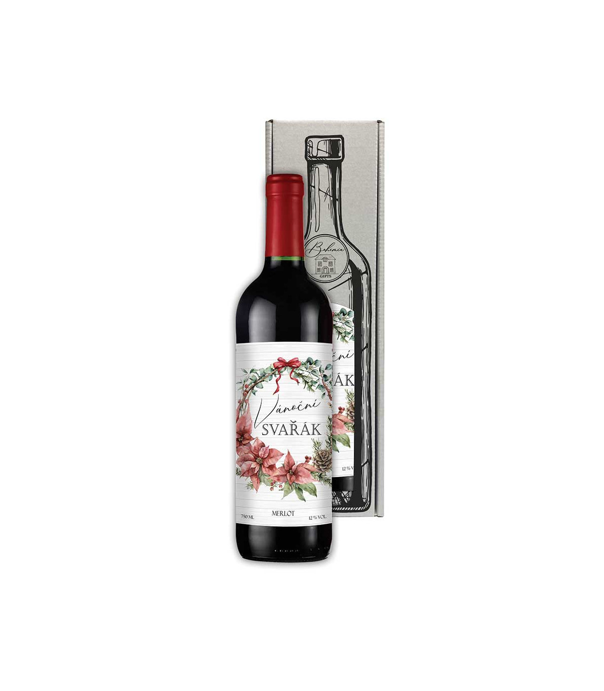 V darčekovej škatuľke nájdete červené víno Merlot a vrecko s korením na prípravu vareného vína.