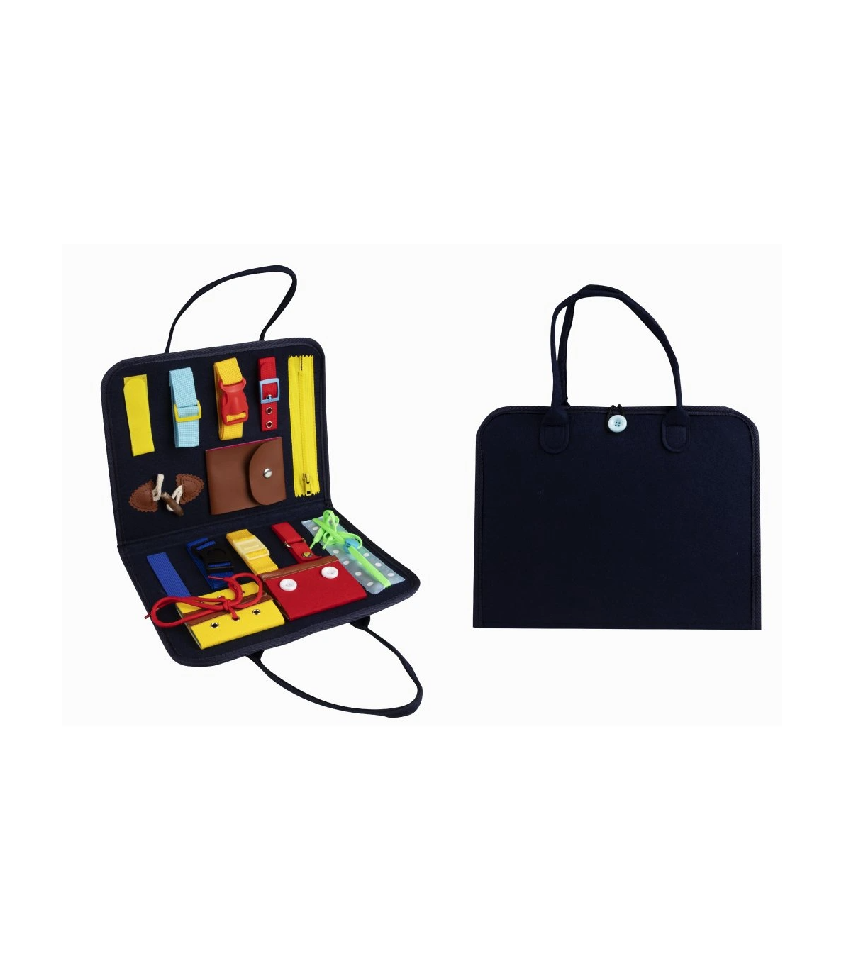Montessori zmyslová knižka v tmavomodrej farbe podporuje rozvoj jemnej motoriky, logiky aj tvorivosti detí.