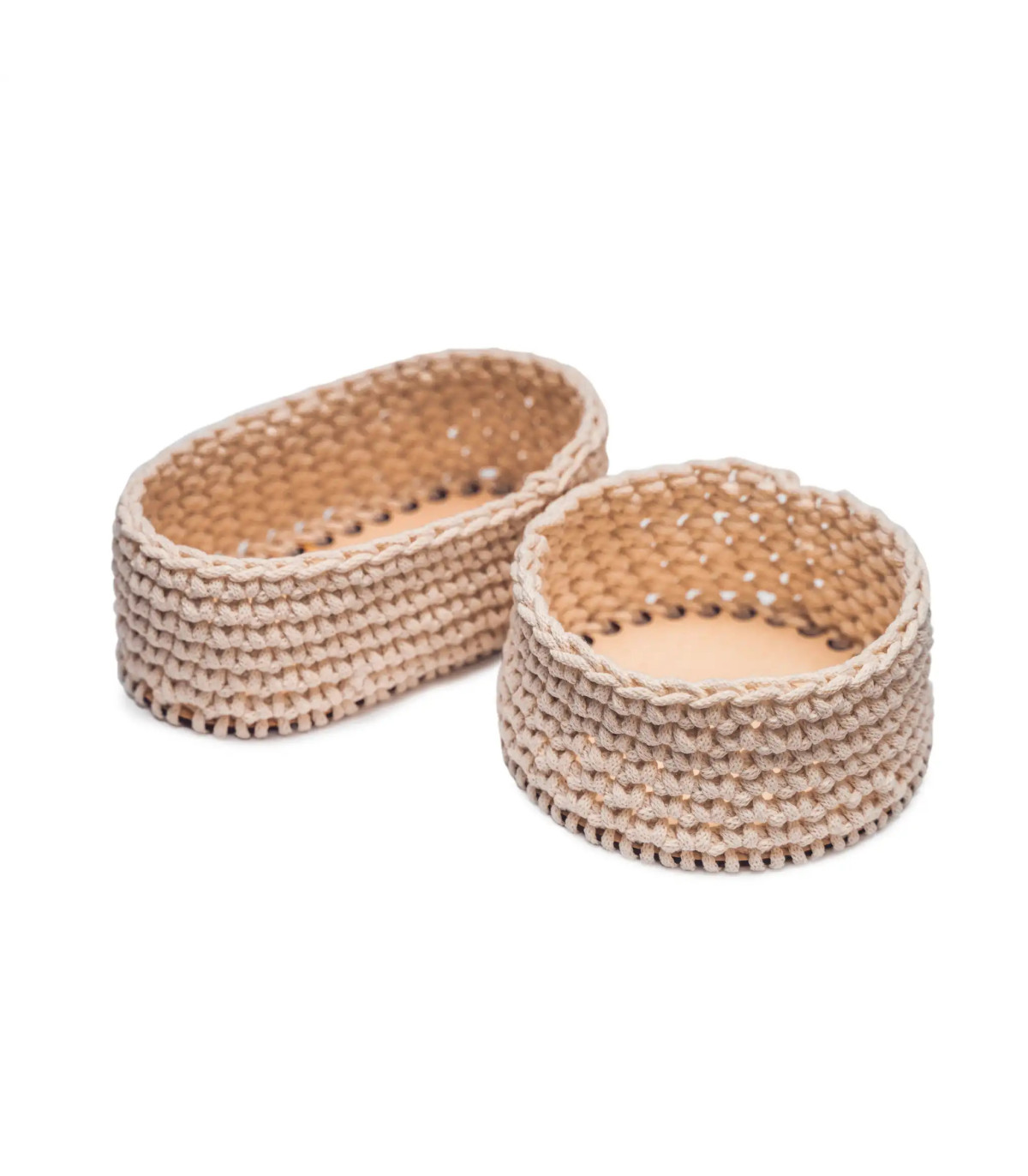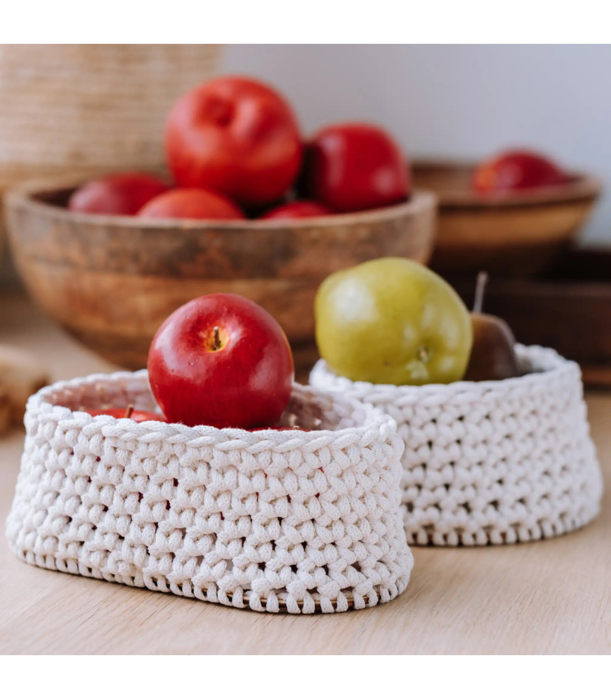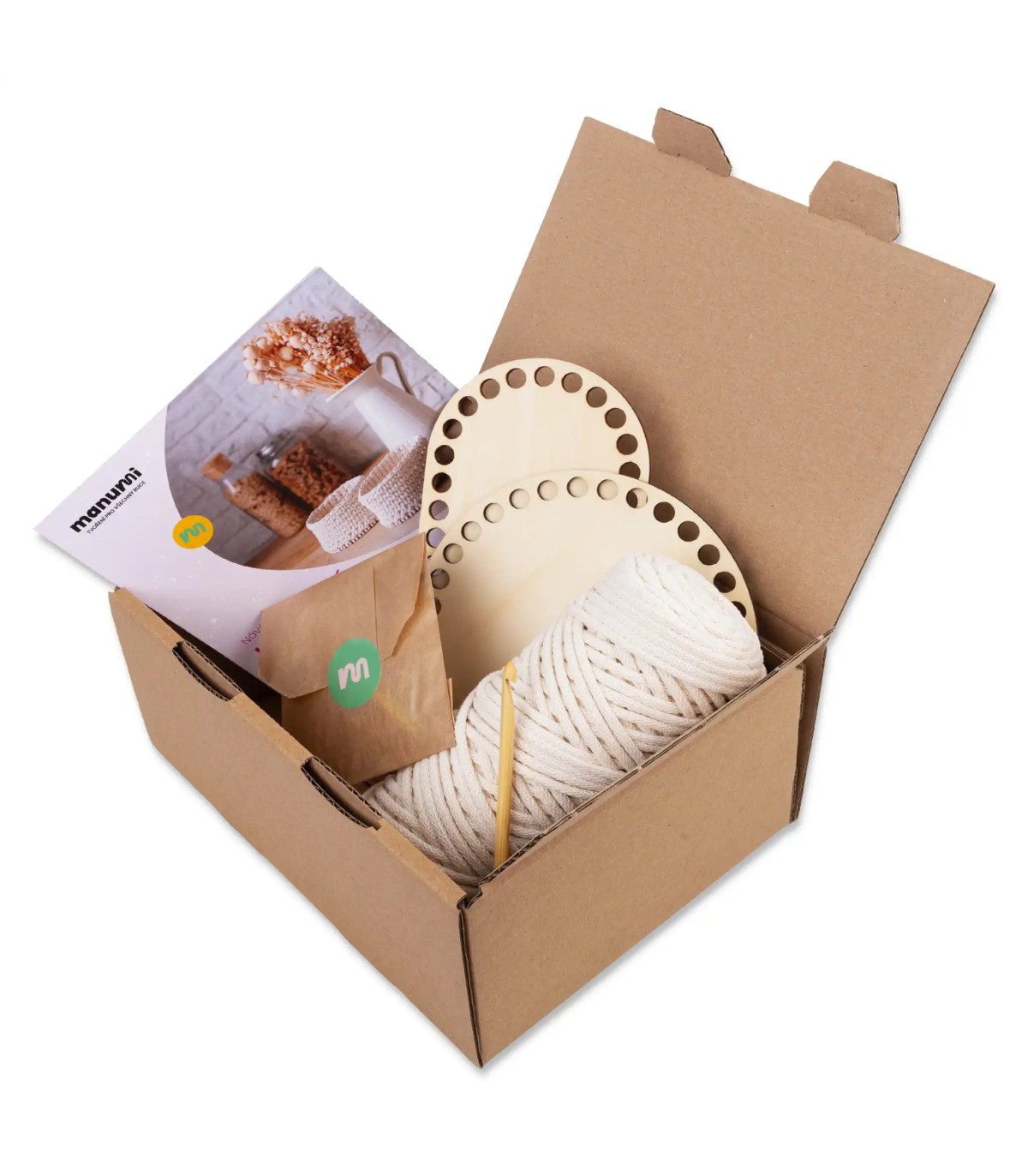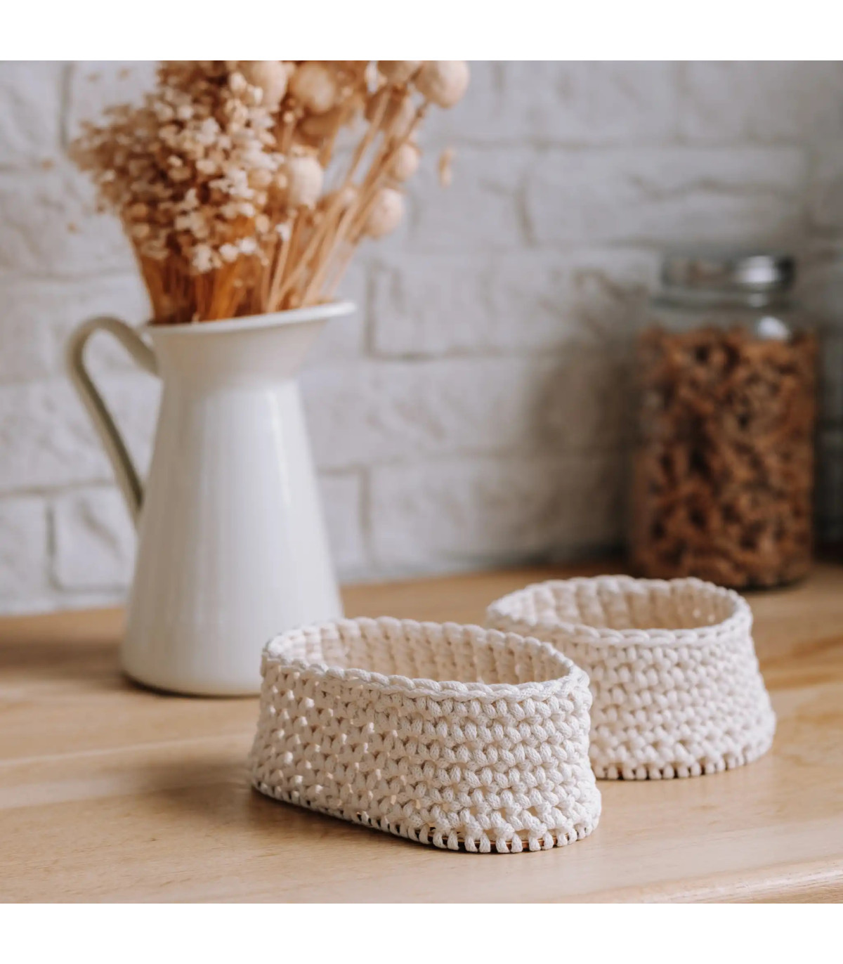 Súprava obsahuje všetko, čo budete potrebovať na výrobu 2 jednoduchých košíkov. V balení nájdete šnúru, dve drevené dná (okrúhle a oválne), bambusový háčik na háčkovanie, plastové veľké ihly na zakončenie a podrobný návod na výrobu košíkov s fotografiami. Navyše získate aj odkaz na video návod, v ktorom vám ukážeme celý postup krok za krokom. Na výrobu budete ďalej potrebovať iba nožnice, trochu trpezlivosti a chuť tvoriť.