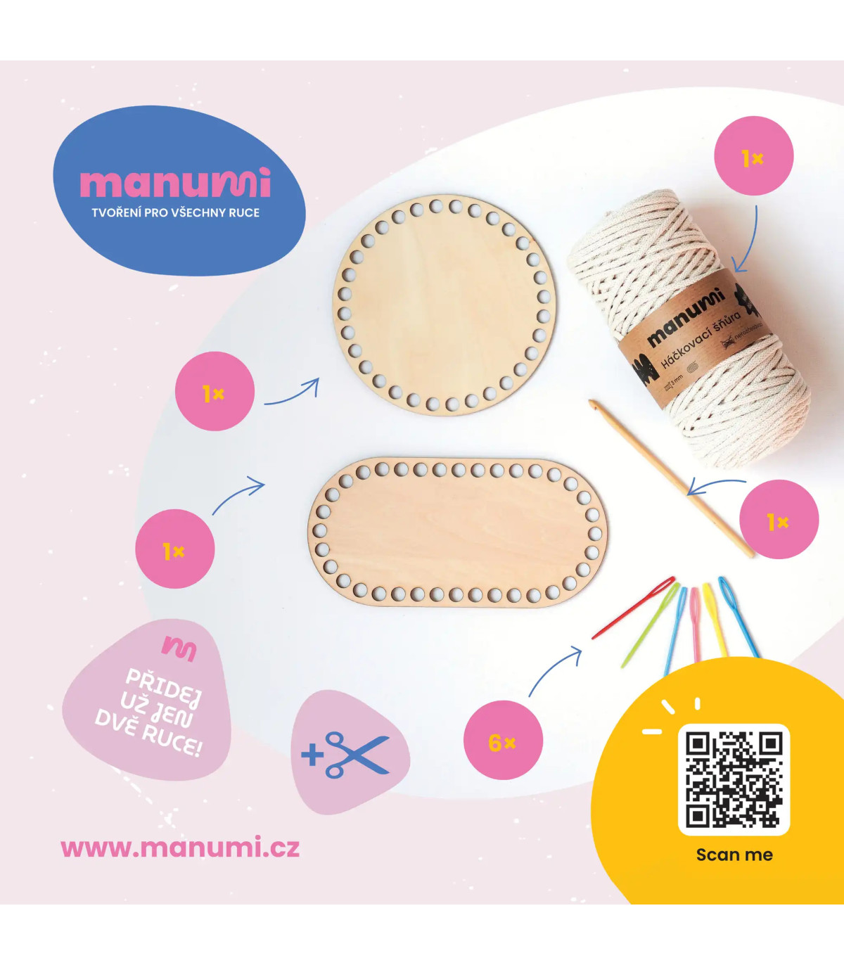 Obsah súpravy: 1 x šnúra, 2 x drevené dno (okrúhle a oválne), 1 x bambusový háčik na háčkovanie, 4 x plastové tupé ihly a návod.