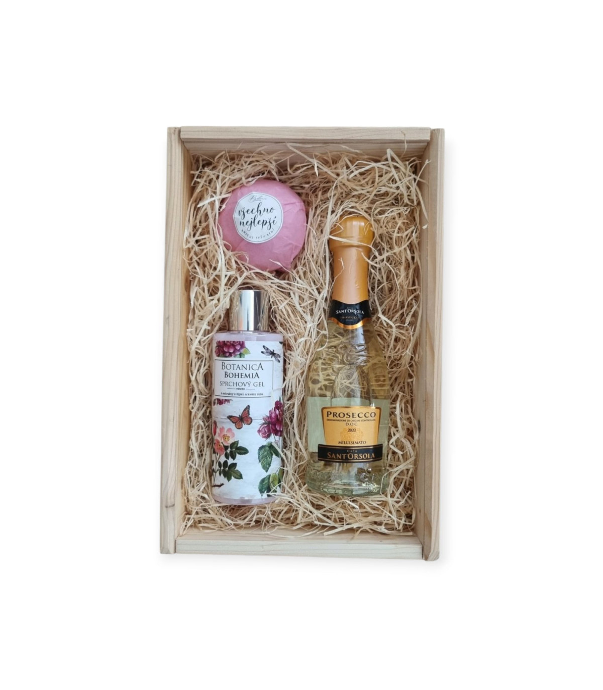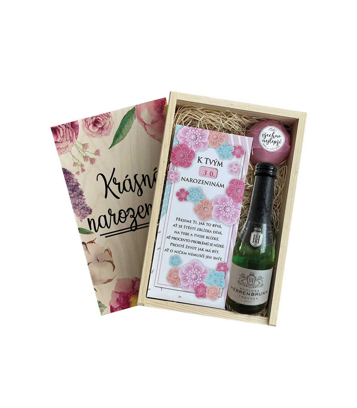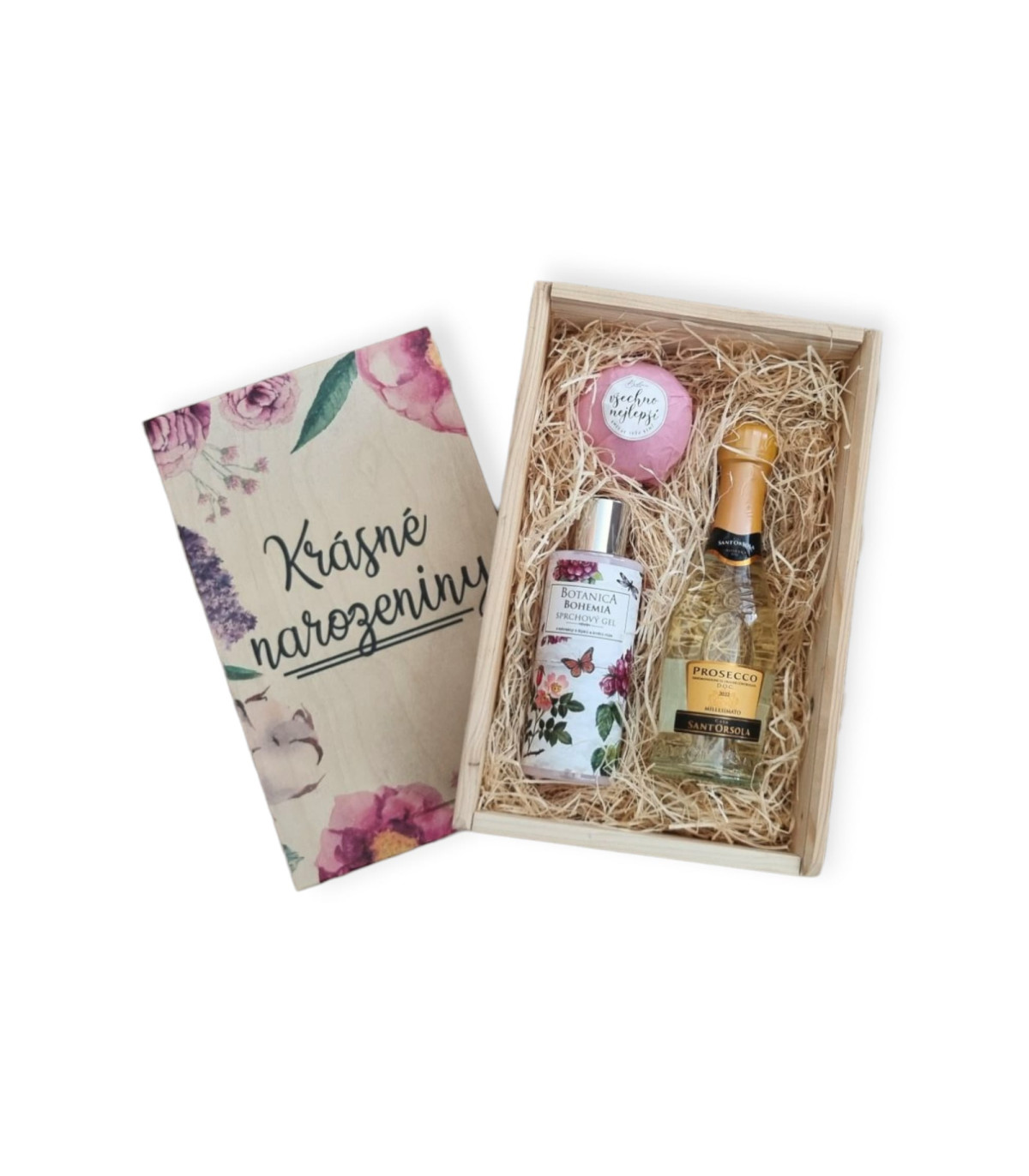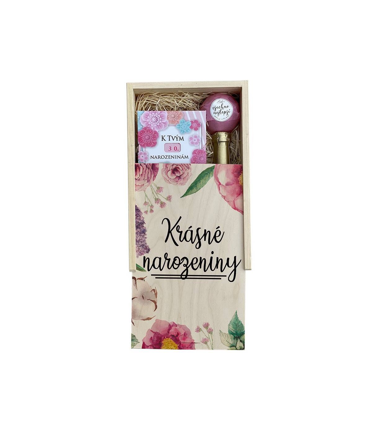 Narodeninová debna z dreva predstavuje ideálny darček pre ženy bez ohľadu na vek. Vo vnútri vkusného balenia sa nachádza vynikajúce šumivé víno – ideálny prípitok oslávenkyne. Mliečna čokoláda s kvetinovým obalom, na ktorom je možné nastaviť vek oslávenkyne a ako perlička šumivá penivá bomba do kúpeľa. Už si nemusíte lámať hlavu s darčekom, pretože s touto súpravou rozhodne nemôžete šliapnuť vedľa.